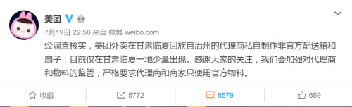 近日,一个印有“清真大众食品双箱盛放”的美团外卖扇子传到网上,部分网友因此表示不满,到美团、美团外卖等美团点评集团旗下的App评论页刷一