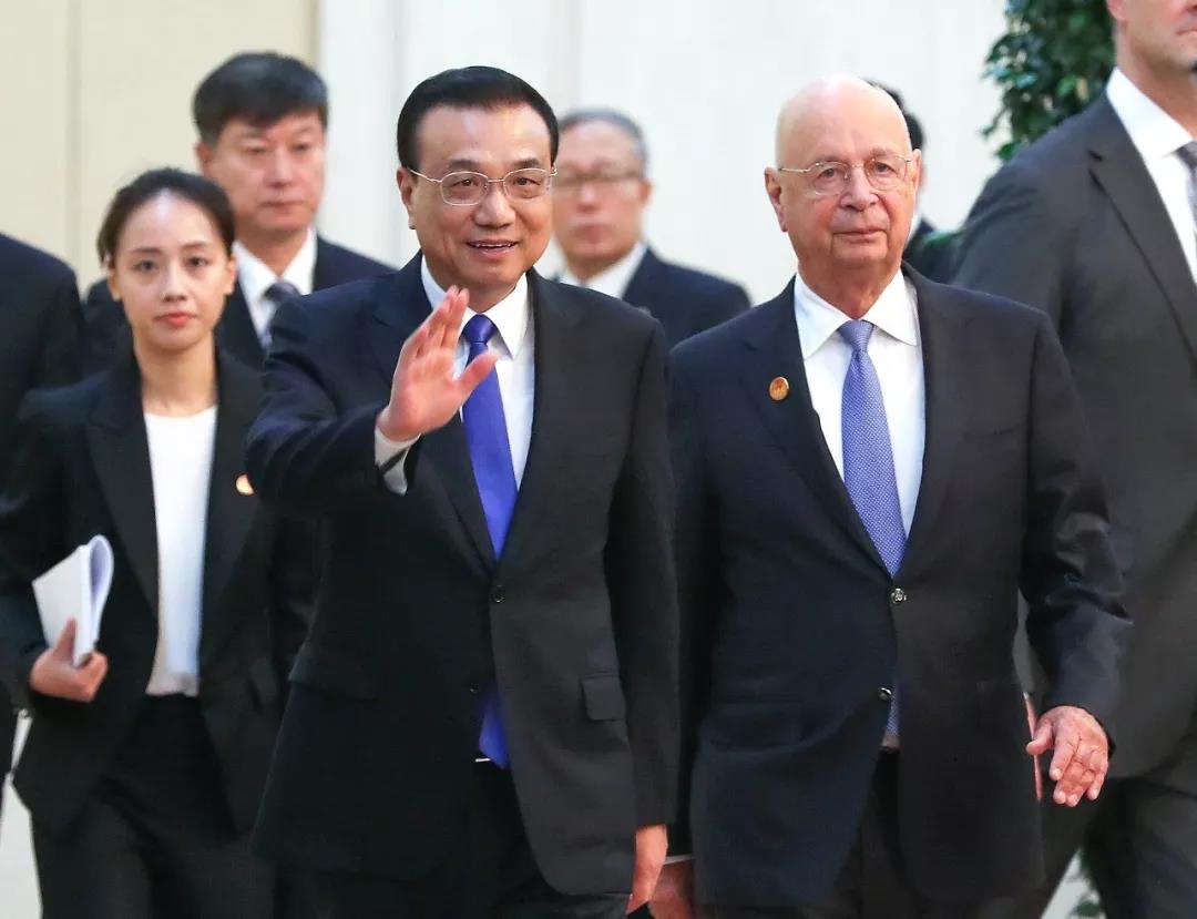 李克强就中国金融开放、知识产权保护、减税降费、创新创业、世界贸易体制改革等问题回答了提问。世界经济论坛主席施瓦布主持对话会。来自中国