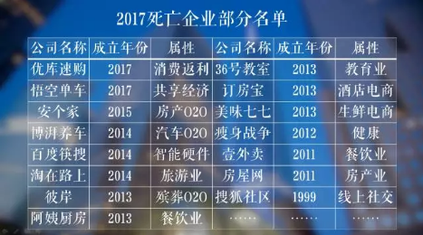 上月发布的《2017中国创新创业报告》显示,2017年有150家创业企业阵亡。其中存活最久的是搜狐社区,成立于1999年;存活最短的比如优库速购、悟