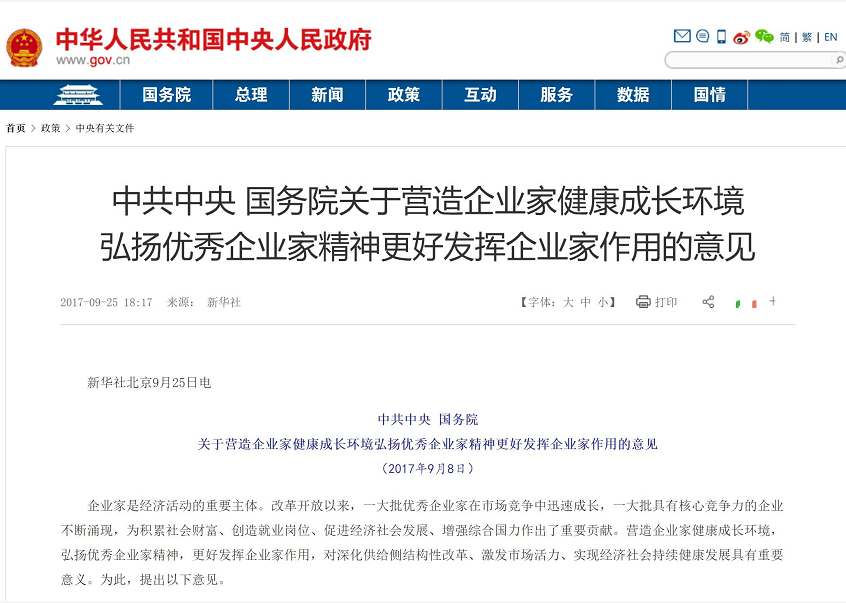9月25日,《中共中央国务院关于营造企业家健康成长环境弘扬优秀企业家精神更好发挥企业家作用的意见》正式公布。这是建国六十多年来中央首次以