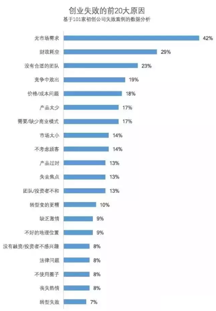 从缺乏产品与市场的相配到团队成员的不和,通过分析101个创业失败案例,我们总结了创业失败的前20大原因。