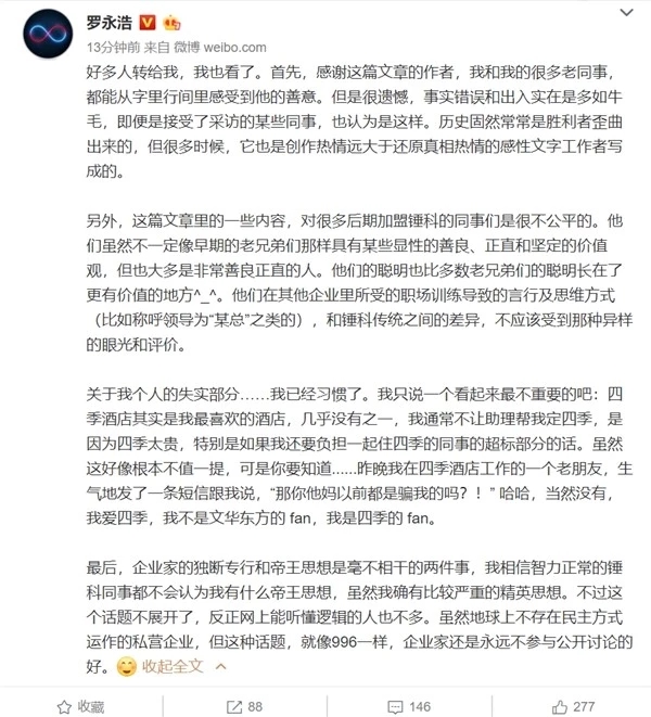罗永浩表示:“企业家的独断专行和帝王思想是毫不相干的两件事,我相信智力正常的锤科同事都不会认为我有什么帝王思想,虽然我确有比较严重的