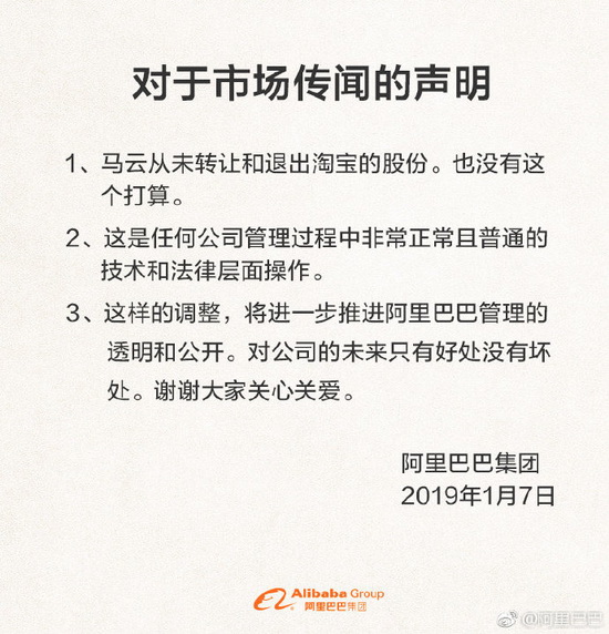 针对马云出清淘宝股权的市场传闻,阿里巴巴集团向IT时代网发来声明称:马云从未转让和退出淘宝的股份,也没有这个打算;这是任何公司管理过程中