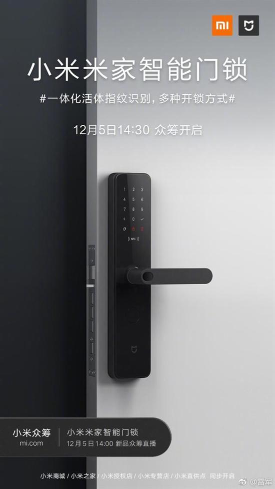 12月4日消息,小米科技创始人兼CEO雷军宣布,小米米家智能门锁将于12月5日下午14:00在小米商城直播众筹发布 ,这是一款配有C级智能锁芯