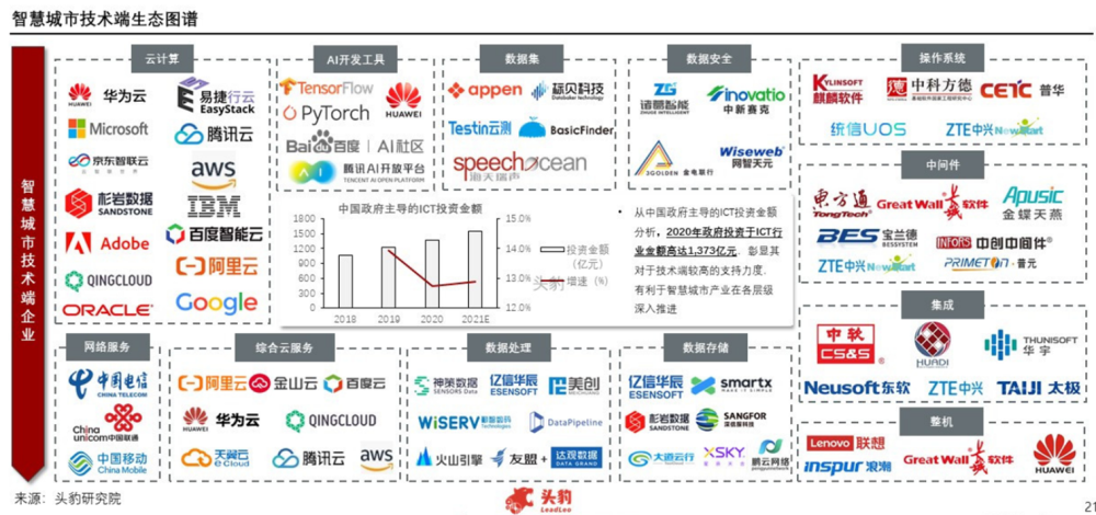 放眼智慧城市整个生态图谱,其技术层涵盖云计算、人工智能、大数据、硬件系统等企业。