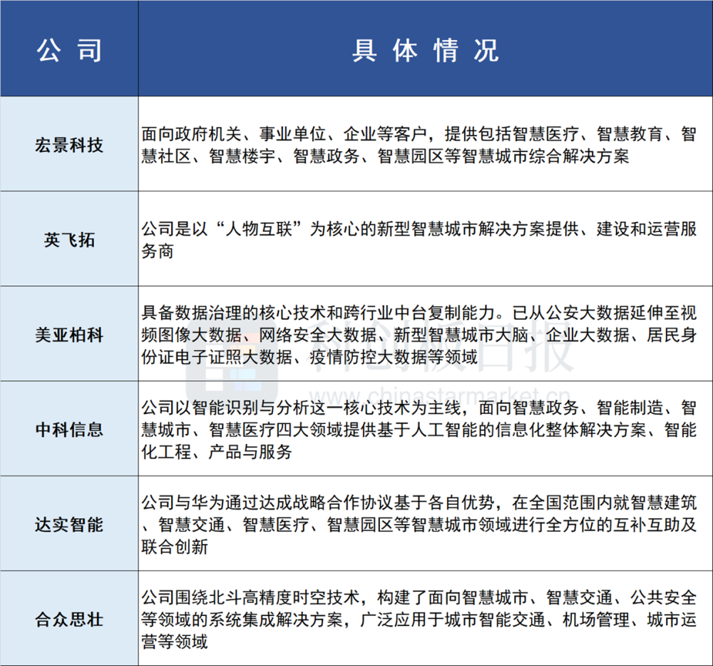 另据《科创板日报》不完全统计,A股中已布局智慧城市相关业务的公司有: