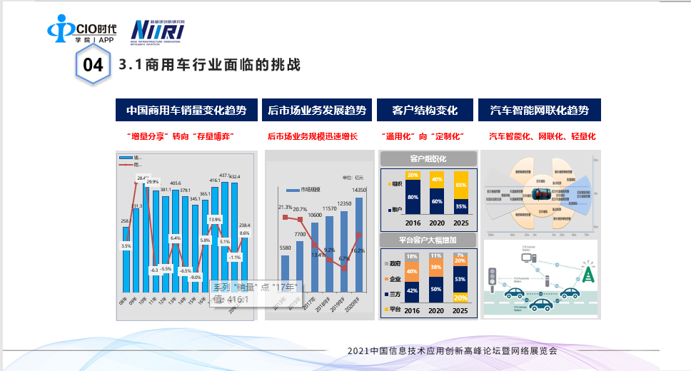 第四是产业链系统的互联,围绕着福田有8千个经销商、服务商, 2千多家成规模的运营商,也就是围绕着商用车的一个企业生态,快速地把它们连接到一起,必须在研发层面、订单交付层面、服务协同层面、质量层面、成本控制层面做好数字化。