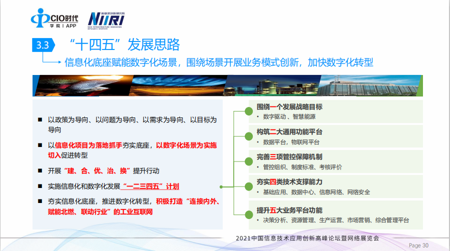 我们的十四五发展思路,是两头都要抓,信息化作为数字化转型的基础,如果没有数字化,不把业务进行固化,同时源源不断地把完整、准确的信息输送上来,数字化和场景的运行目的,也是不可能达到的。所以,我们在十四五过程当中做了两个规划,一个是十四五信息规划,另外一个就是数字化转型规划。一个目标是围绕着数字赋能,还有就是智慧能源,智慧能源不限于现在供应的天然气的能源,而是所有的能源,包括可再生能源和传统的化石能源相结合的能源,把我们能源的供应,让客户应用的效率更高更合理,同时更绿色。