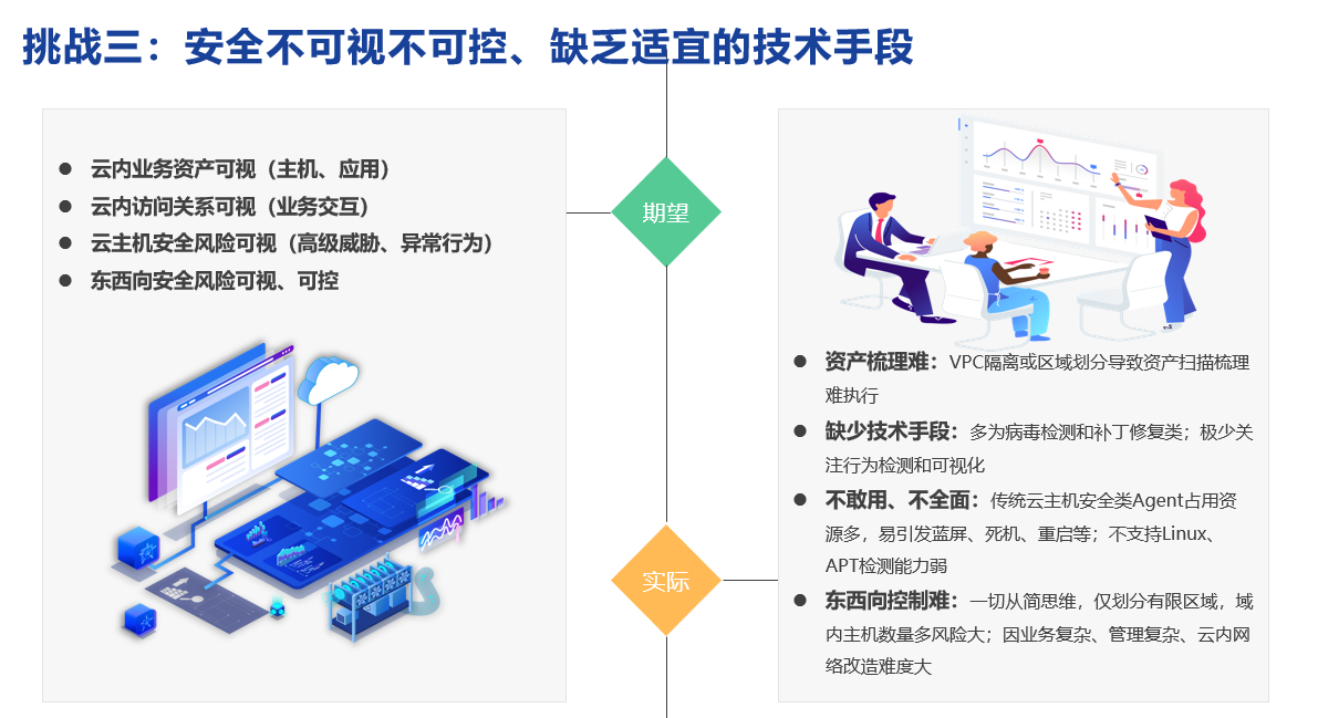 面对这些挑战,有的企业会尝试把这些事情交给专业的服务商。但是交给服务商也有一些问题。比如公有云和私有云,公有云的问题是业务的数据安全和数据主权到底在哪儿。还有一些合规的问题,比如一些重要的信息,一旦暴露会产生各种风险。
