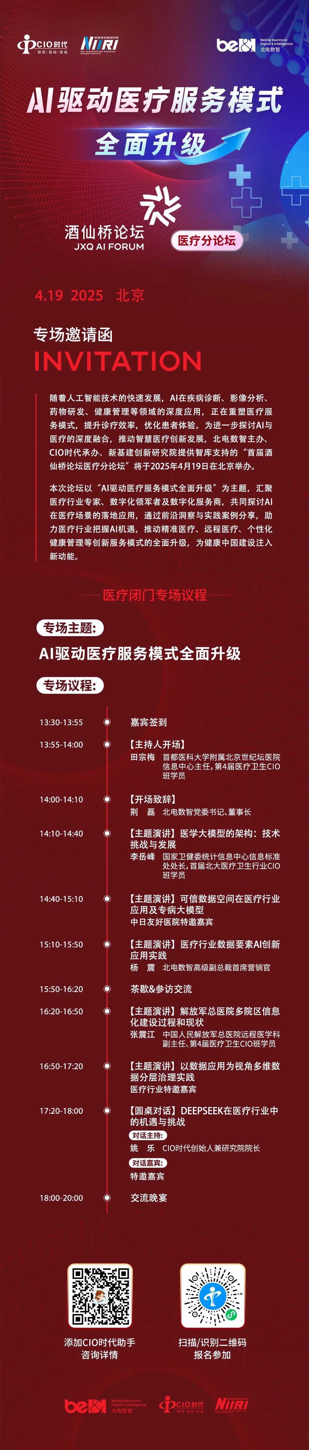 为了进一步推动医学领域数字化转型进程,探索DeepSeek等AI技术赋能医疗创新及融合之道,4月19日,由CIO时代主办、新基建创新研究院作为智库支持的“酒仙桥论坛——医疗分论坛”活动将于北京举办,现场将邀请相关领域专家学者及CIO班学员们聚焦AI+医疗,分享医疗行业数字化转型成果,探索DeepSeek热潮下的医疗数字化转型新未来。