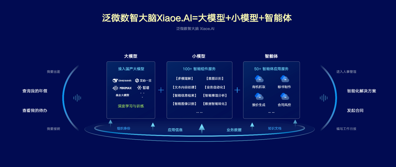智能化并非单一技术,而是多项技术融合。泛微产品整合了OCR、RPA等数字化技术,借助大模型推理分析的能力,针对办公场景进行数智化升级。泛微推出的“数智大脑Xiaoe.AI”,旨在重新定义未来智能办公模式。