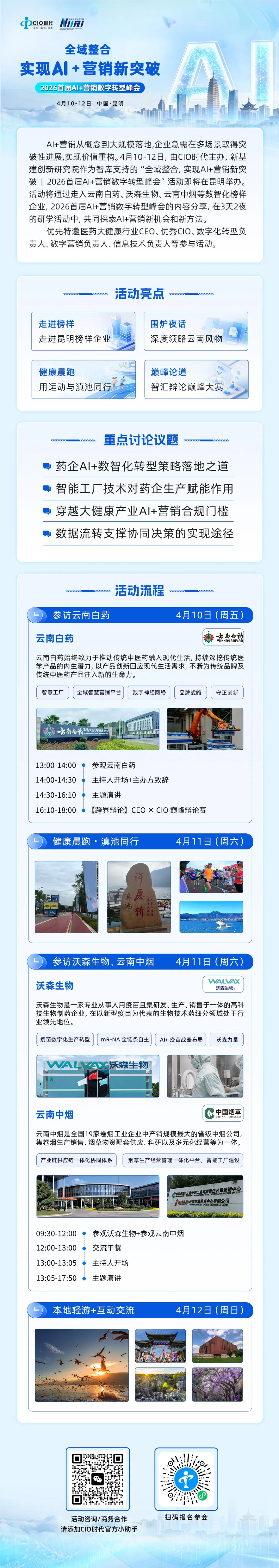 活动将带领参与者走入云南白药、沃森生物、云南中烟等数智化榜样企业,通过现场参观和主论坛分享,开拓眼界,积累经验,为实现AI+营销新突破奠定坚实的基础。