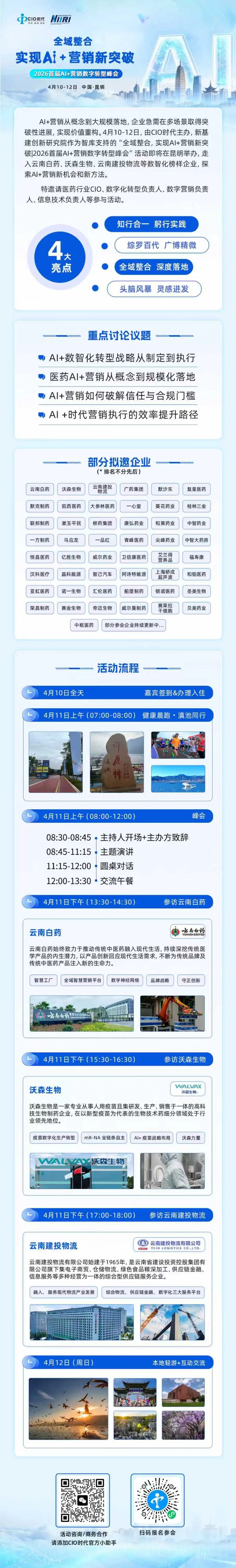 活动将带领参与者走入云南白药、沃森生物、云南建投物流等云南数智化榜样企业,通过现场参观和主论坛分享,从战略破局、落地路径入手,把握转型关键因素,为实现AI+营销新突破奠定坚实的基础。