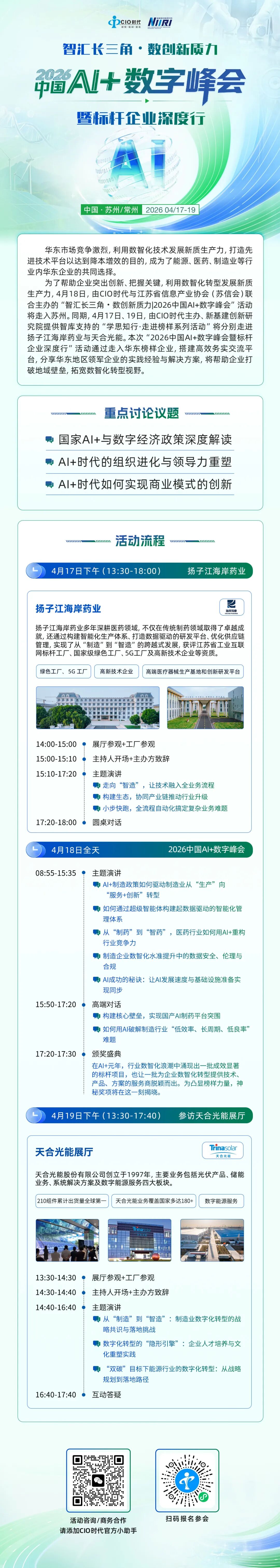4月18日,由CIO时代与江苏省信息产业协会(苏信会)联合主办的“智汇长三角・数创新质力 | 2026 中国AI+数字峰会”活动将走入苏州。通过搭建高效务实交流平台,分享华东地区领军企业的实践经验与解决方案,将帮助企业打破地域壁垒,拓宽数智化转型视野。