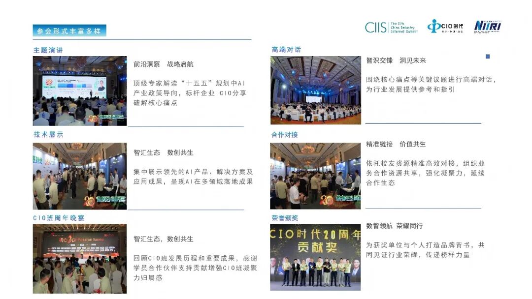 持续创新形式,打造多元化、高价值特色环节:精品展览展示、标杆案例评选、CIO 圆桌对话、校友交流晚宴、一对一商务对接、闭门研讨沙龙等。