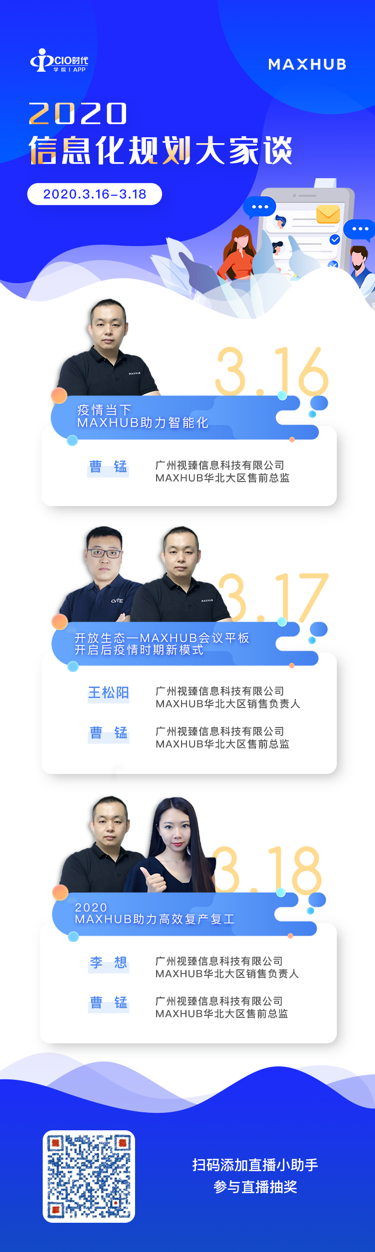 2020年3月16日-2020年3月18日MAXHUB将在CIO时代2020信息化规划大家谈为大家带来连续三天的专场直播。