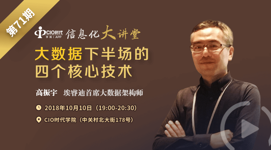 2018年10月10日,第71期CIO时代信息化大讲堂将以“大数据下半场的四个核心技术”为主题进行了深度及开放的探讨。
