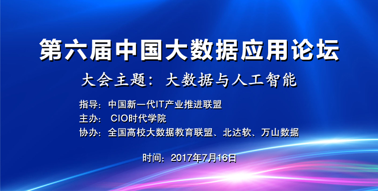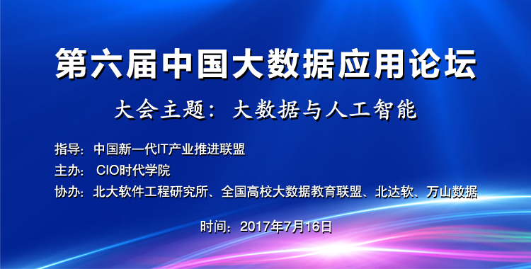 2017年7月16日,“第六届中国大数据应用论坛”将于北京大学隆重召开。本次会议由CIO时代学院主办,中国新一代IT产业推进联盟指导,全国高校大