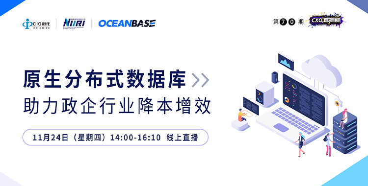 11月24日,由CIO时代、与OceanBase联合举办,新基建创新研究院作为智库支持的主题为“ 原生分布式数据库助力政企行业降本增效”的第70期CXO直